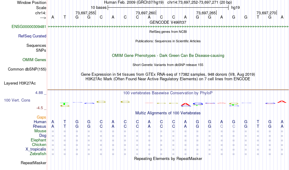 - CTCF[chr14:73697252-73697271]