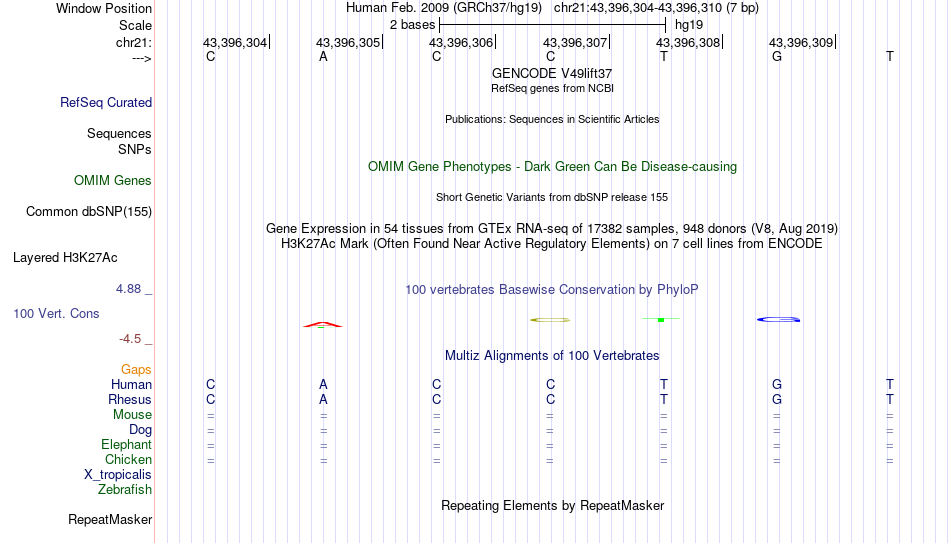 - PTF[chr21:43396304-43396310]