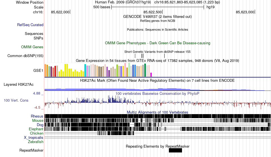 | chr16 | 85622830 | rs372344513 | G | T | 4625871 | |