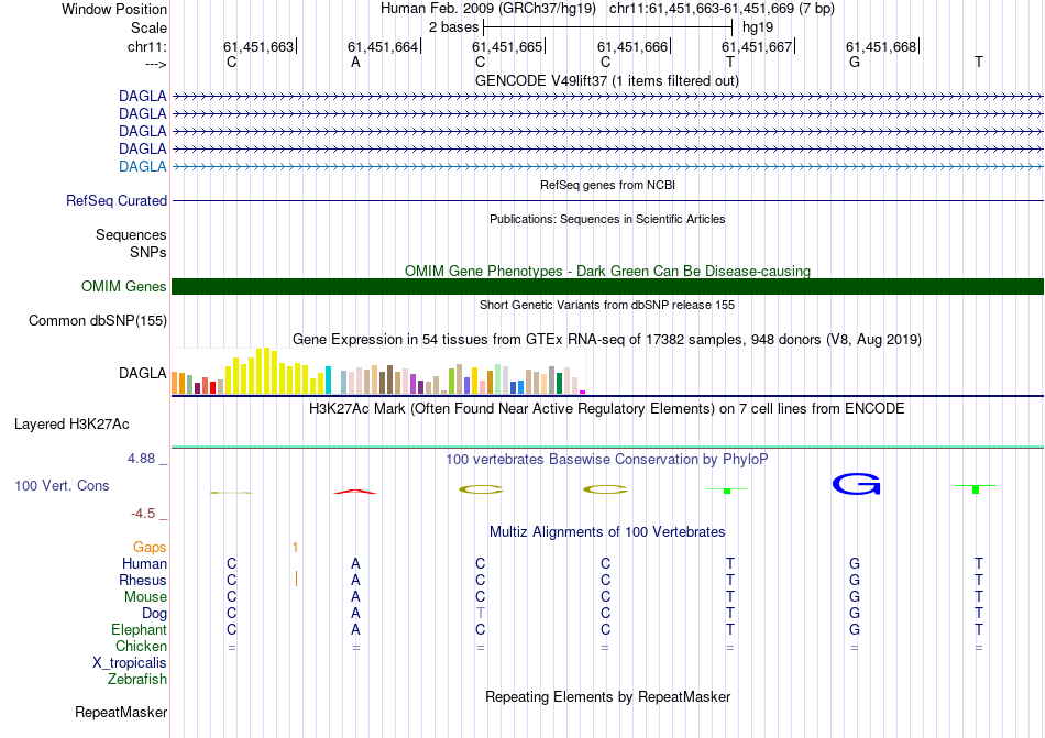- PTF[chr11:61451663-61451669]