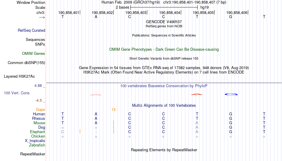 - PTF[chr3:190858401-190858407]